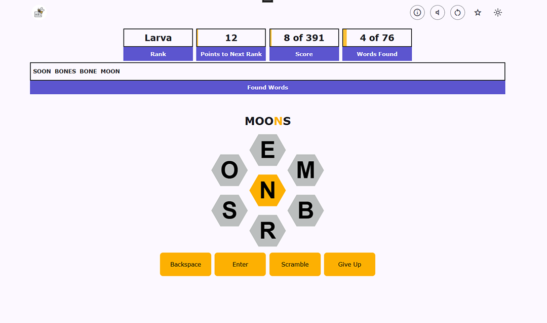 With Spell Bee, you can dive into a world of random puzzles where the objective is to create as many words as possible from a given set of letters. Each puzzle is designed to test your creativity and word-building skills. Whether you're a casual player looking for a quick challenge or a word enthusiast seeking a more intense experience, Spell Bee has something for everyone. You can solve puzzles at your own pace or take on the ultimate challenge of solving all the puzzles in one click.